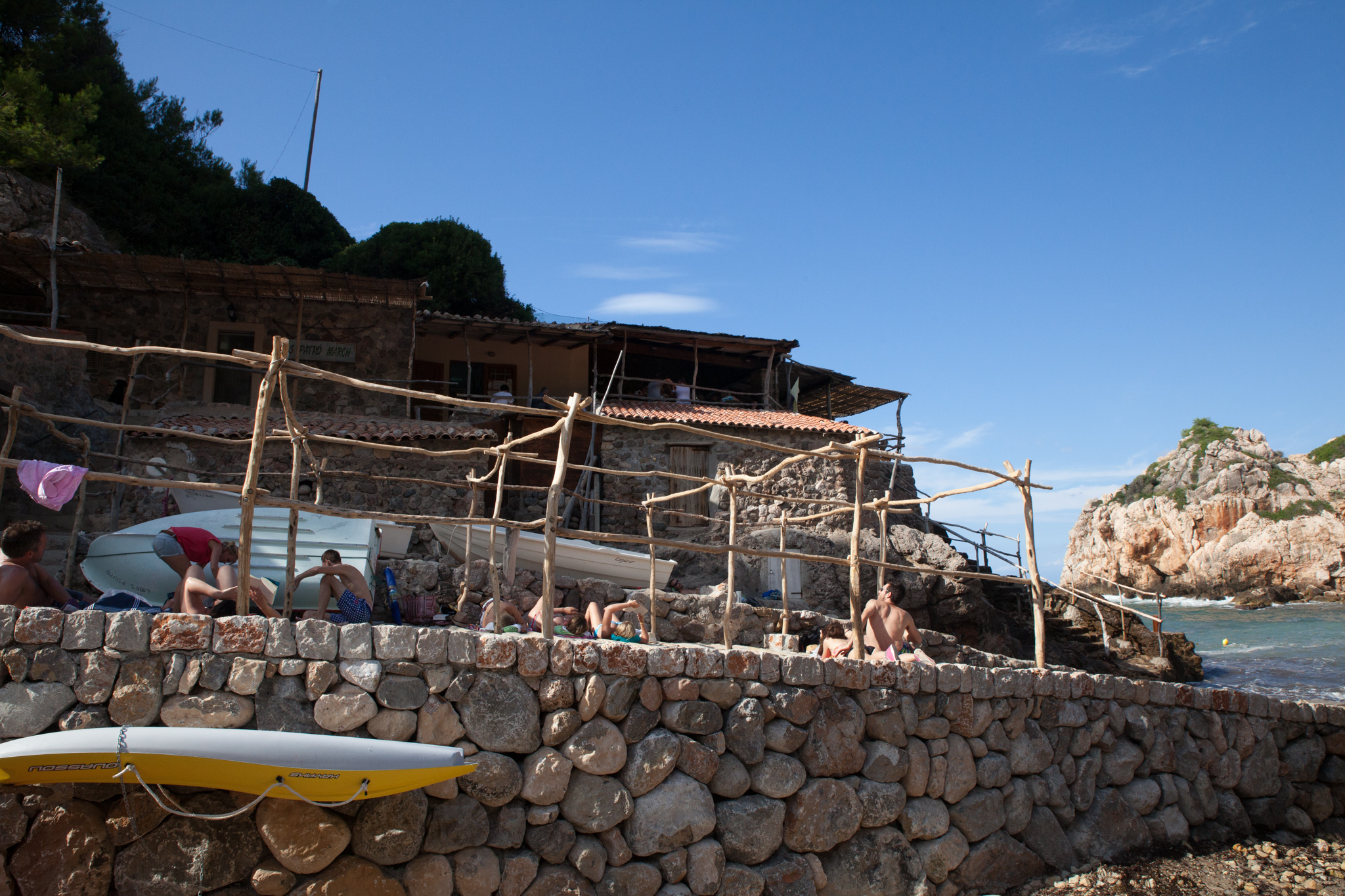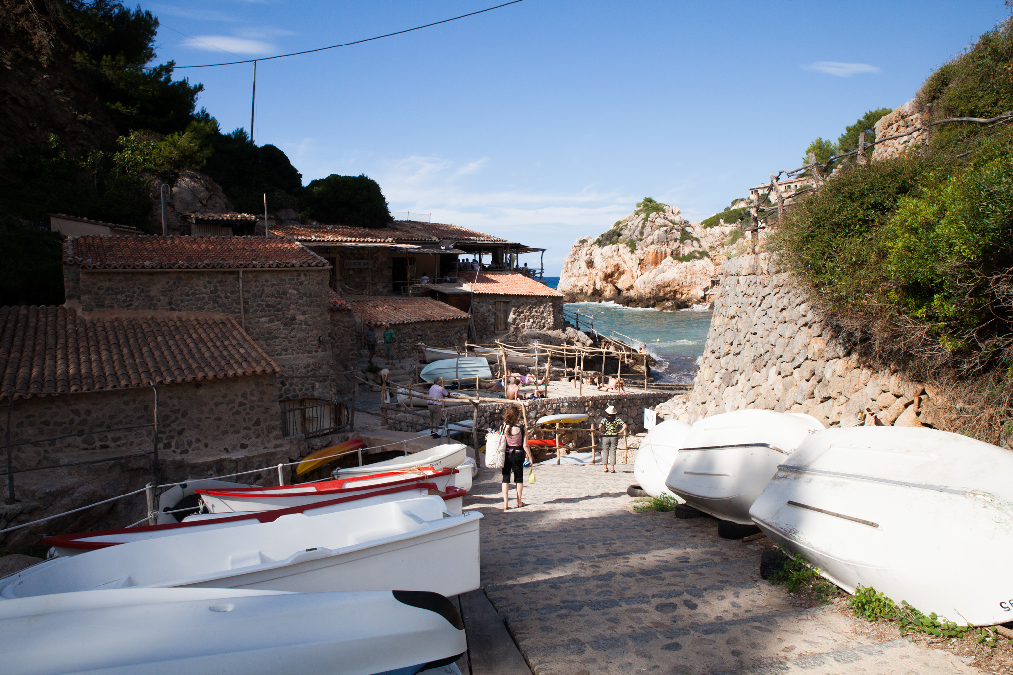 Da wollten wir uns einen Strand suchen, und dachten wir vertrauen mal wieder unserem Reiseführer und es wie so oft leider ein Fehler. Wir wollten zur Cala de Deiá, die vom Reiseführer als "malerisch" beschrieben wurde. Wir packten also unser Strandgerümpel (Handtücher, Strandmuschel, Krims, Krams, Dies, Das und Jenes), suchten 45 Minuten lang den Weg der zum Strand führt, fuhren 10 Minuten die Serpentinen runter, zahlten in freudiger Erwartung mal wieder 2 EUR für den Parkplatz (wie überall auf der Insel) und marschierten die letzten Meter in Richtung Wasser. Und was erwartete uns am Ende des Weges? Eine kleine Felsbucht mit zwei sehr schön gelegenen Restaurants. Baden, geschweige denn Aufbauen der Strandmuschel oder Ausbreiten des Strandgerümpels war leider nicht möglich. Somit machte ich also ein paar Fotos, wir ruhten uns 15 Minuten aus und es ging wieder mit dem Auto die kleine Serpentinenstraße hinauf. Nun ja, wir hätten ja auch den Unterschied zwischen Playa und Cala wissen können....